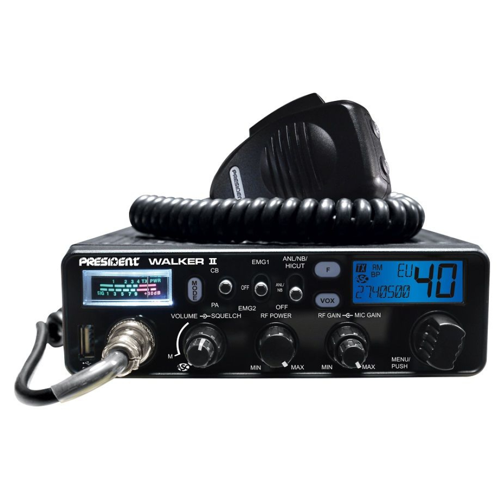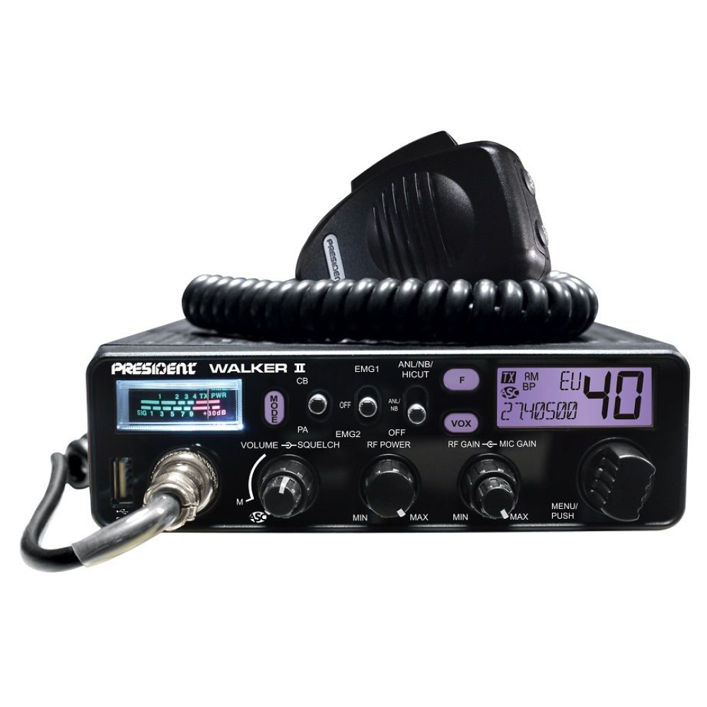 De President Walker II ASC Classic is een 27MC transceiver met 40 kanalen AM/FM en een zendvermogen van 4 Watt.President Walker II ASC Classic is alleen te gebruiken op 12 Volt en heeft heeft een USB aansluiting (5V 2.1A) aan de voorzijde.